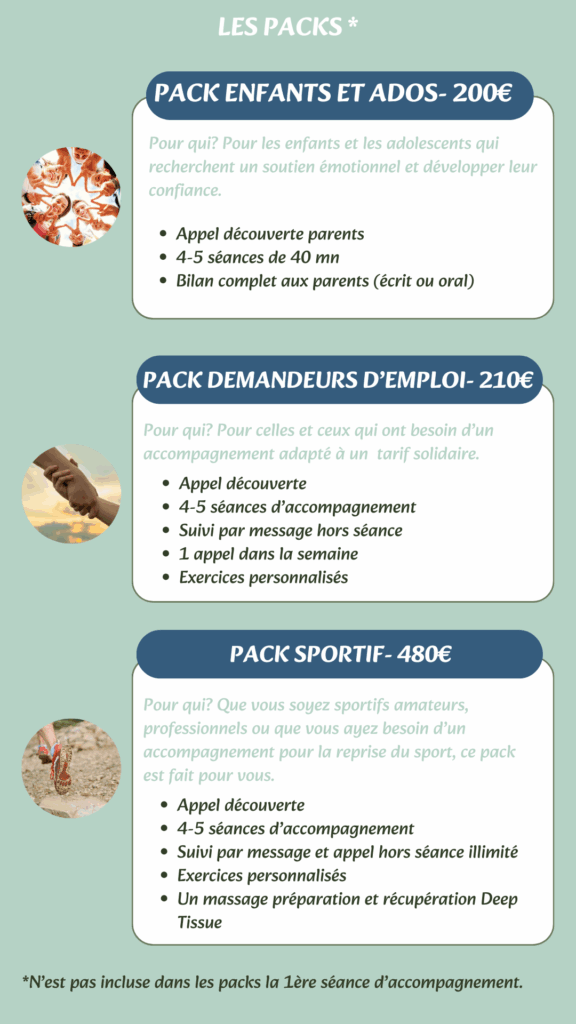 Mes accompagnements durent généralement entre 4 et 5 séances, en fonction de vos objectifs, de la situation, avec un suivi bienveillant et de qualité entre chaque étape.